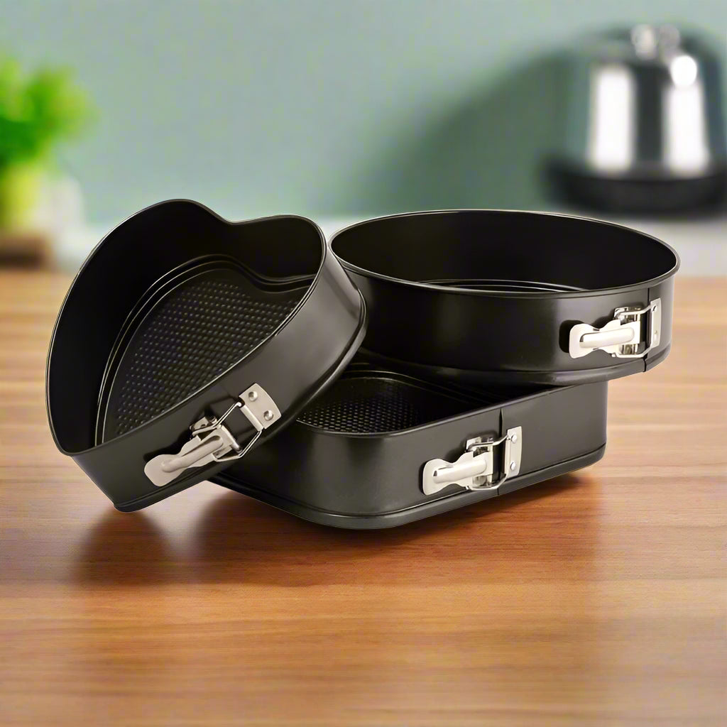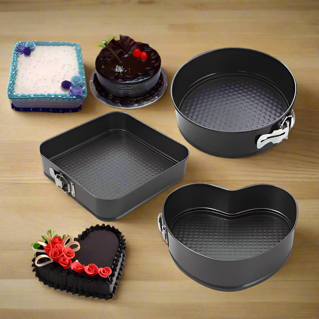 Teflon Coated Spring Form Cake Mould Pan Set Baking Tray Heart, Round, and Square Shape Cake Maker Non-Stick Cake Baking Tray 3 Piece Mould Set